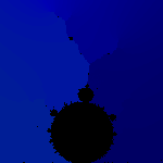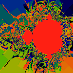 If you look carefully at this picture, several interesting things are happening. First, the interior of the M-set is colored. Ignore this; this is an unrelated artifact of the algorithm. Next, notice how the red-black edges (almost) line up over multiple bands. If we picked a larger R, they would line up invisibly well. Anyway, they seem to line up and point at the tips of shoots.