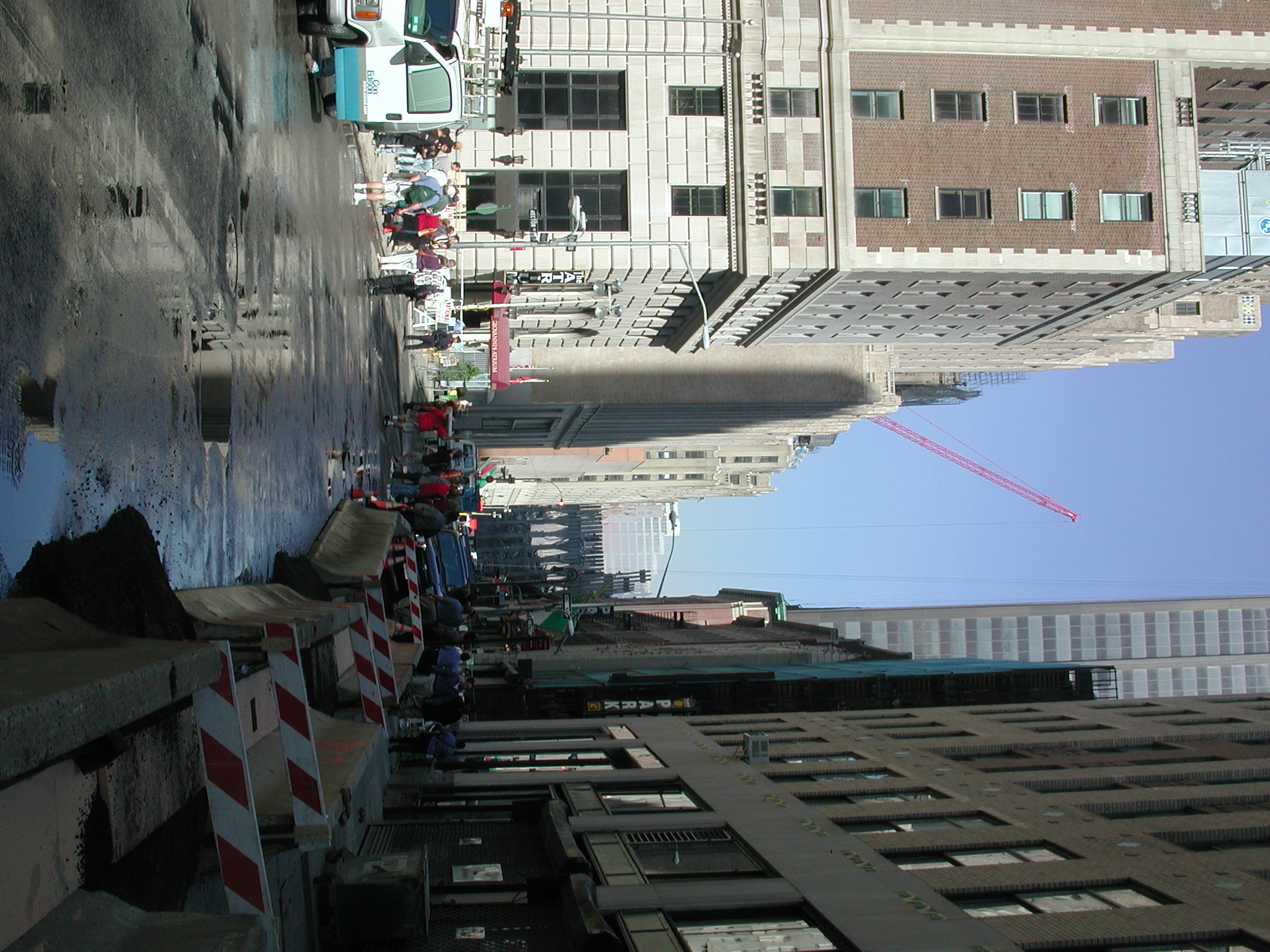 Rector Street intersects the West Street, a wide north-south boulevard which passes by the WTC site. A series of photos, 013-018 were taken walking north toward the site. There were no barricades or guards along this path, which was surprising for most of the site perimeter is carefully guarded by police and the military and the public is kept at least two blocks distant and usually much farther away.