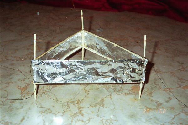Here are the BB Racer photos, built exactly the same as the lifter but in the horizontal plane and suspended from the ceiling. Tissue paper is used to fill the back half of the racer. Because it travels at 4 metres per second the BB Racer needs to be reasonably aerodynamic. The nose is a plastic needle this is to add a bit of weight to hold the nose down!