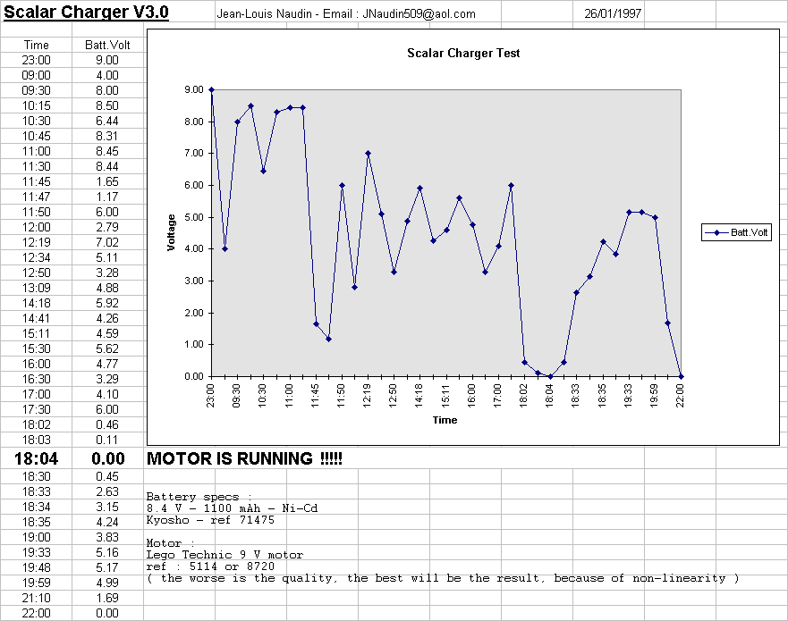 The most strange event is that after 19 hours of running time, the battery voltage drop to 0 volts, and the motor continued to run ( !!! ?? !!! ). It seemed that the condensators could maintained power to supply motor after this first deadline. You could see on my report that the charge of battery restart after, for new 4 hours ( strange and curious event ?? ). I couldn't explain today what happened, but it's reality. I don't know if it is the good way for overunity, I have the feeling that it isn't......