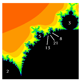 The ideas in the previous section allow us to show the presence of the Fibonacci sequence in the Mandelbrot set. Forget for the moment about the rotation numbers and concentrate only on the periods of the bulbs (the denominators). Call the cusp of the main cardioid the ``period 1 bulb.'' Now the largest bulb between the period 1 and period 2 bulb is the period 3 bulb, either at the top or the bottom of the Mandelbrot set. The largest bulb between period 2 and 3 is period 5. And the largest bulb between 5 and 3 is 8, and so forth. The sequence generated (1, 2, 3, 5, 8, 13,...) is, of course, essentially the Fibonacci sequence. See Figure 11.