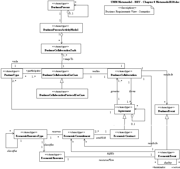 The REA ontology is comprehensive, applying globally to all classes of transactions we could think of. However it is also quite atomic and abstract, and its implications on financial reporting or general ledgers are not entirely clear. REA includes no explicit mechanism for financial reporting. Ongoing work on REA is evident in the UMM releases in 1999 and 2000, and the work of ebXML Business Process workgroup. REA resources and events necessary for very basic accounting realization are included in the BRV of the TMWG's UMM, excerpted below:
