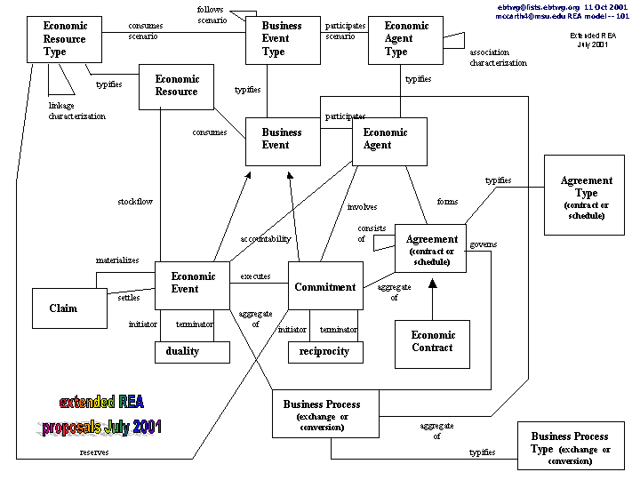 Later models are similarly process oriented. October 11, 2001 McCarthy posted the following model to the mailing list of the ebTWG (the successor group to ebXML). Economic commitments and events are almost the same as the 2000 model. "Claim" has been added, and stereotypes ("Types") are added for R,E, and A. These are cited by McCarthy as the foundation of accounting recognition. The other classes such as agreement types and BP types will also be necessary in account classification (although not entirely sufficient for GAAP determination).