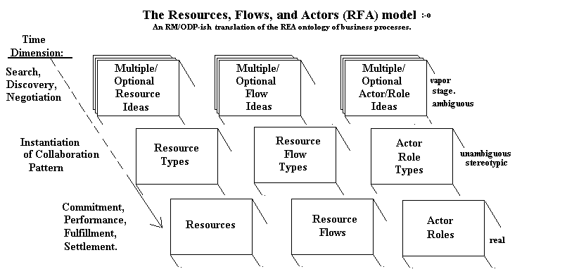 One might playfully entertain the idea of an RM/ODP'ish expression of REA, in which the UML diagram is renamed to align with RM/ODP but also, is a 3-dimensional model made of balsa wood blocks and toothpicks. The 3rd dimension is time. In other words, look at the extended REA model above as, changing over time as trading partners evaluate each other and figure out whether, and how, to do business.