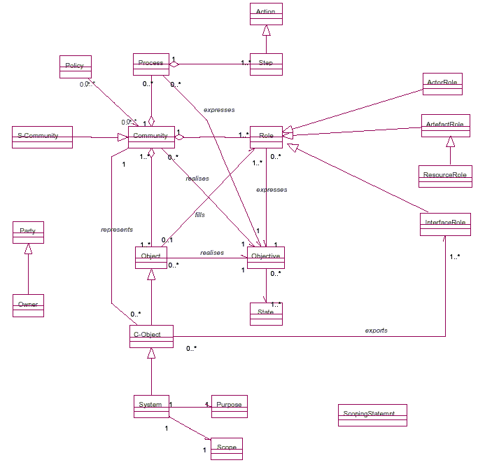 The ISO 10746 Enterprise Viewpoint language has "agents" but they are not synonymous with "economic agent" or "partnerTypes". The ISO 10746 synonym would be "party roles". It is interesting to peek at one diagram from the large RM/ODP specification, FCD-15414 annex A, "Overall Structure of an Enterprise Specification", 9-9-2000:
