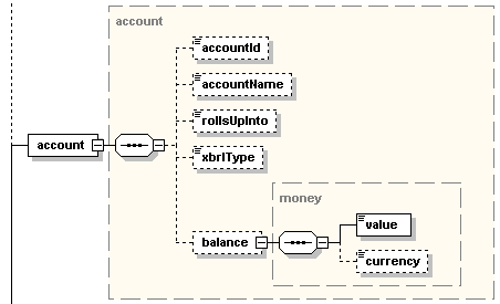The arapXML:Account type is used to specify any classification necessary in the implementation. It is intrinsic to a GL that there is some classification by natural account or tax category. Account code and/or account name may be used in classic accounting style. Account is also used to transport an account balance or balances in the controlTotal element of the transactionSet. The rollsUpInto enables hierarchies of account codes to be enumerated. xbrlType associates an account with an element in an xbrl taxonomy.