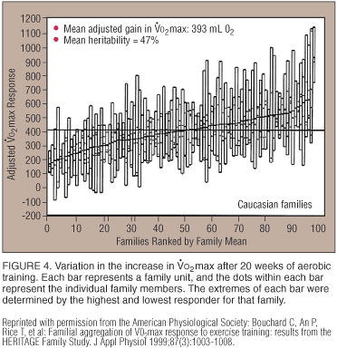 One of the most interesting research findings of the past 10 years is the wide range of responses among subjects. Some subjects experience little or no improvement in VO2max with aerobic training (low responders), and others experience changes of 50% or more (high responders). In the HERITAGE Family Study,8 742 subjects representing more than 200 families completed a 20-week supervised aerobic training program. Using cycle ergometers three times per week, subjects began at an intensity of 55% of VO2max for 35 minutes and gradually increased to 50 minutes at 75% of VO2max for the last 6 weeks. Every subject completed exactly the same training program, yet the increase in VO2max ranged from 0% to over 50% (figure 4). Maximal heritability estimates for both VO2max and the response of VO2max to training are about 50%.